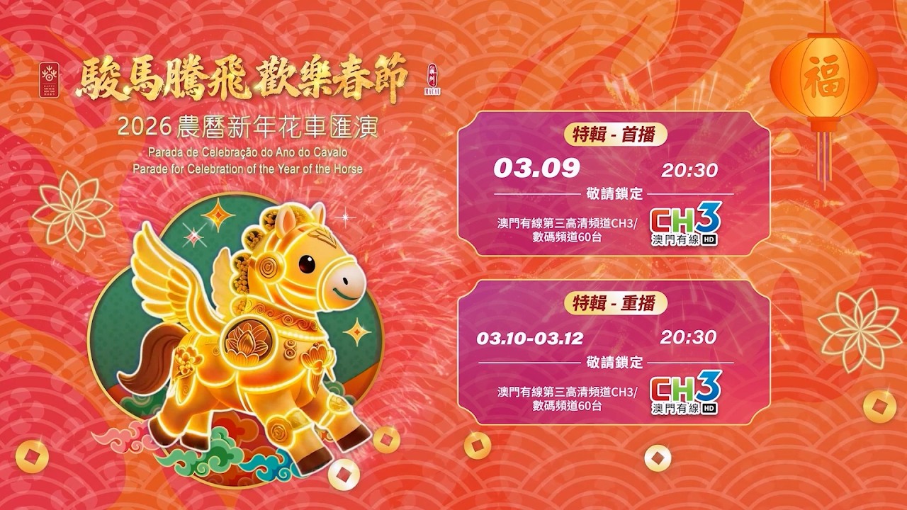 由旅遊局主辦的「駿馬騰飛 歡樂春節 2026農曆新年花車匯演」於2月19日至3月8日熱鬧登場。今年花車匯演實現多維度提質升級,匯聚17部花車聯同約1,300位表演者,還有首次加入3,888架無人機的「2026無人機煙花匯演」。這場盛事活動再次煥發出嶄新的特色面貌。 想再次感受現場歡樂氣氛的你,就記得...