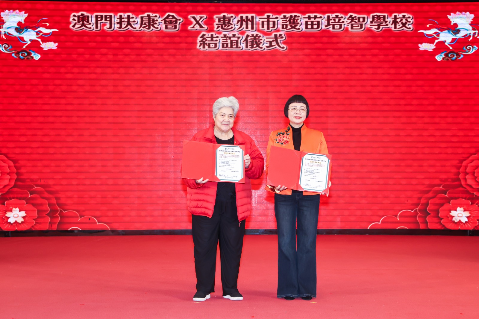 活動同日亦進行了多項交流合作環節,進一步深化跨地區協作:澳門扶康會與惠州市護苗培智學校進行結誼儀式,建立長期互動平台,推動服務經驗分享與專業交流;同時,澳門扶康會很榮幸以專業實踐與服務經驗為基礎,參與並擔任《「照護食」灣區標準合作備忘錄》起草人,冀與各地夥伴合力推動更安全、清晰、可落地的標準,讓有吞嚥照護或特別餐食需要的人士及家庭受惠。此外,澳門扶康會與香港炮台山循道衛理中學開展學習交流,分享澳門扶康會在洗衣職業訓練方面的實務經驗,促進職訓理念與服務模式互鑑;同時,澳門扶康會亦與香港扶康會深化餐飲訓練合作,並以「互相學習菜式」作為交流方式,提升餐飲訓練的多元性與實作水平,助力學員累積職場技能、拓展就業出路。活動現場安排了豐富多彩的節目,包括由各服務單位精心準備的歌舞表演,工作人員與服務使用者一同參與,傳播歡樂與美好,贏得全場熱烈掌聲。此外,活動亦設有抽獎環節;澳門扶康會特別感謝多家愛心企業的慷慨贊助,讓每位參與者都能感受到濃厚的節日氛圍。