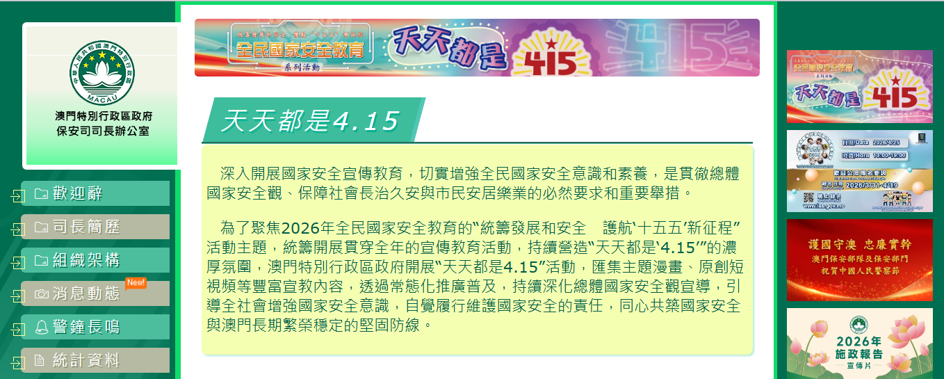 為進一步提高全民國家安全意識,營造「天天都是4.15」的濃厚社會氛圍,澳門特區政府各部門官方網頁於4月15日起統一增設全新欄目——「天天都是4.15」。 該欄目將以生動活潑且公眾喜聞樂見的形式,包括製作主題漫畫、短視頻等多媒體內容,持續宣傳推廣國家安全知識,讓國家安全理念融入...