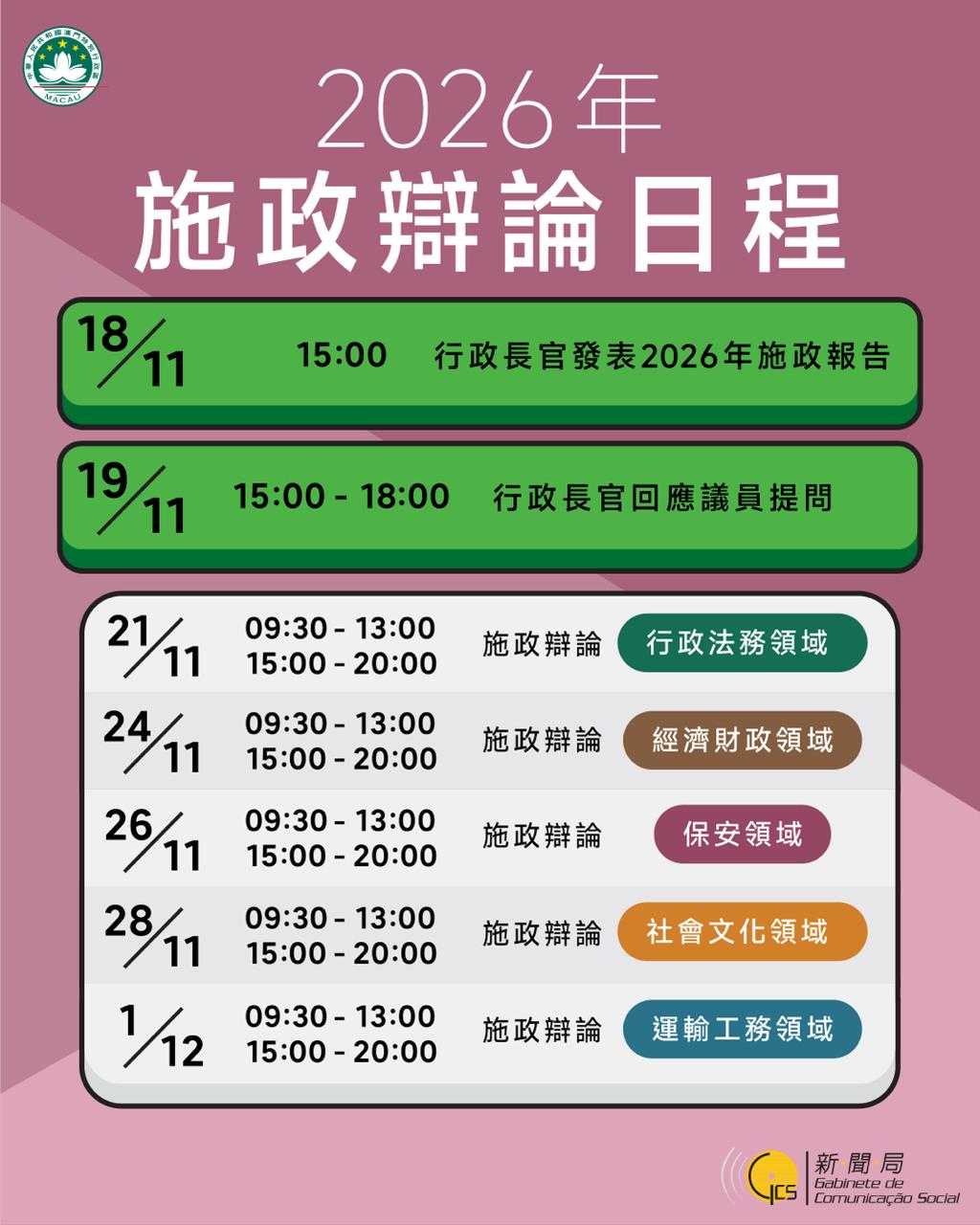 行政長官岑浩輝將於11月18日下午3時在立法會發表2026年施政報告,並於同日下午5時30分在政府總部舉行新聞發佈會,就施政報告內容回答記者提問。岑浩輝於翌(19)日下午3時列席立法會全體會議,回應議員關於2026年施政報告的提問。 澳廣視屬下電視台及電台屆時將會現場直播。公眾亦可透過澳門特別行政區...