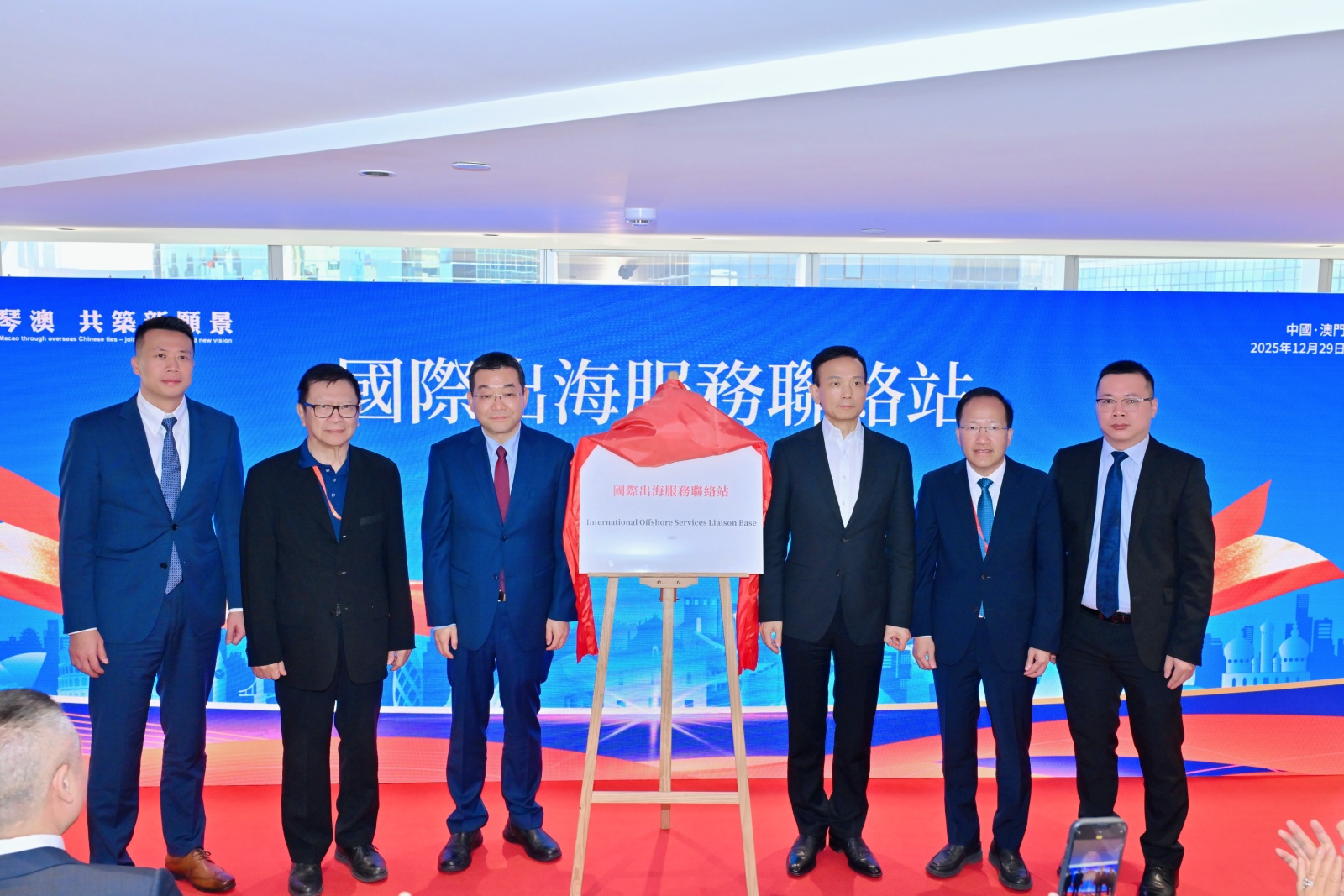 活動現場舉行了隆重的授牌儀式。澳門歸僑總會向大橫琴國際產業中心授予“國際出海聯絡站”牌匾,大橫琴國際產業中心向美國美東華人社團聯合總會、南非洲粵港澳總商會的代表授予“聯絡代表處”證書。