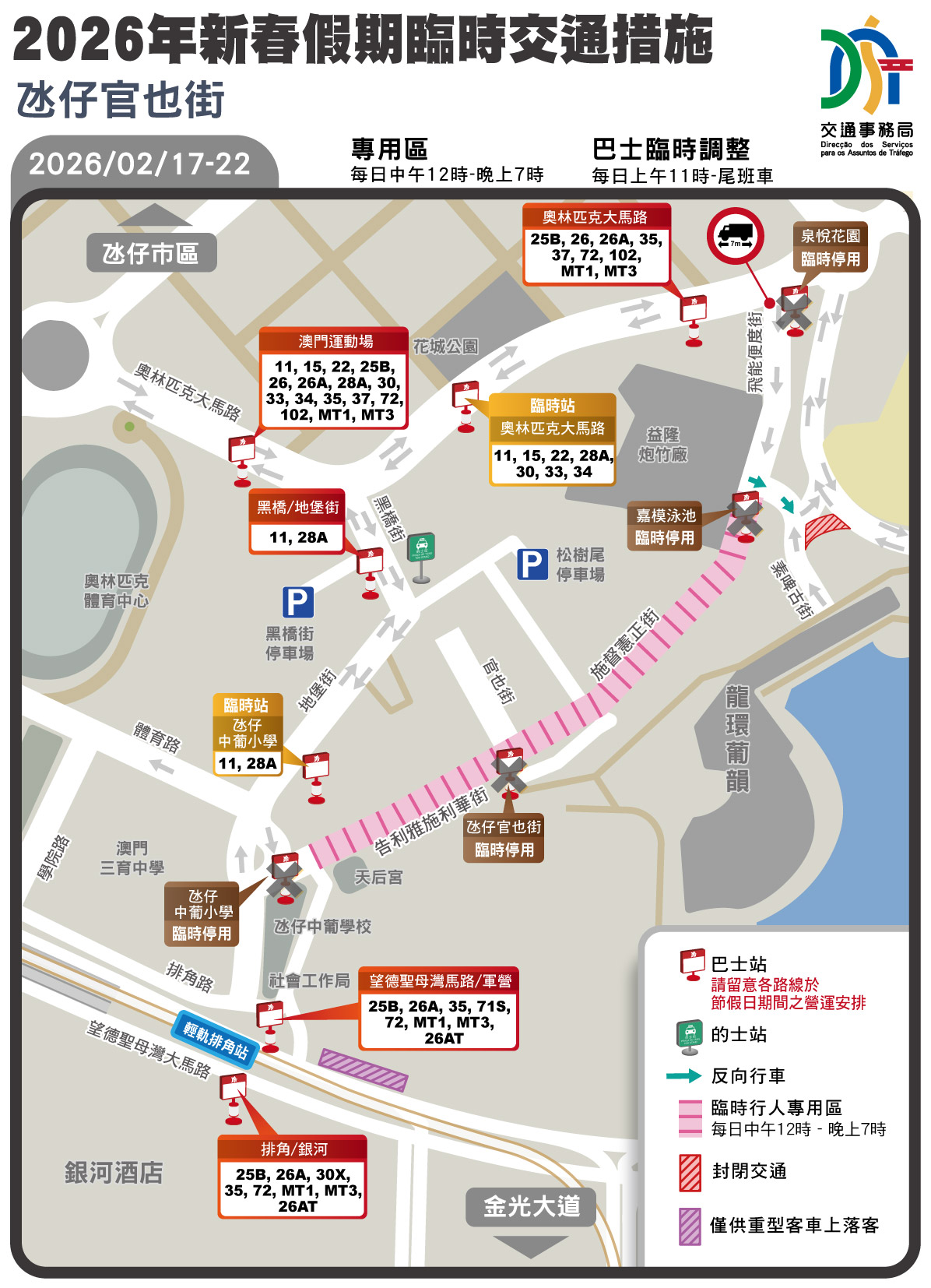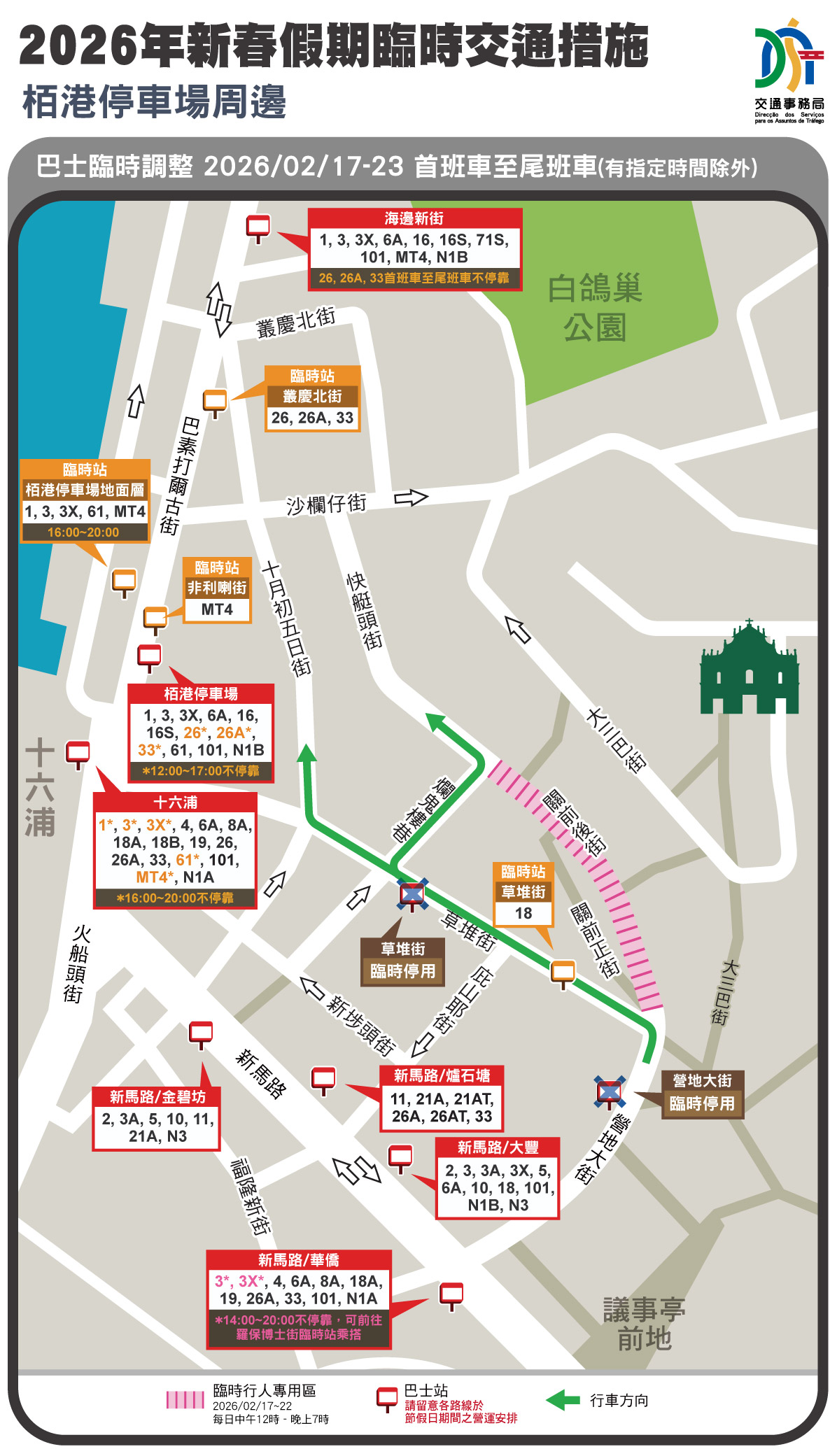 交通事務局運輸管理處代處長阮潔玲表示,新春期間兩巴將繼續營運 5條時節性路線,25AX路線亦將臨時於節假日營運及延長服務時間,加快疏導乘客。而新馬路、南灣、營地大街周邊、栢港停車場周邊、氹仔舊城區,維持實施巴士站點整合或分流安排。