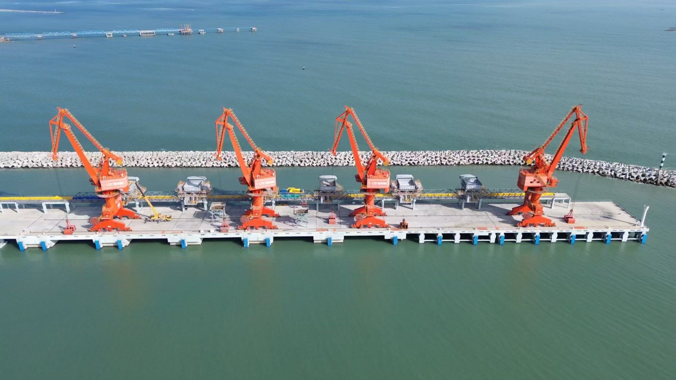 “這個工程項目所在海域常年風浪大、作業條件差,地質條件複雜,泊位岩層起伏大,地質多變,如果使用同一種結構類型,裝卸設備存在不均勻沈降的問題。”項目設計經理周玲娟介紹,為有效攻克上述難題,設計團隊依據不同區域土層特性,創新性地提出採用重力墩、大跨度預應力梁與高樁碼頭相結合的結構形式,將大跨度預應力梁用作碼頭軌道梁。不僅有效解決了複雜波浪條件下波浪受力與波能集中的問題以及地質複雜多變適應性的問題,還最大程度節省了工程造價,縮短了工期。