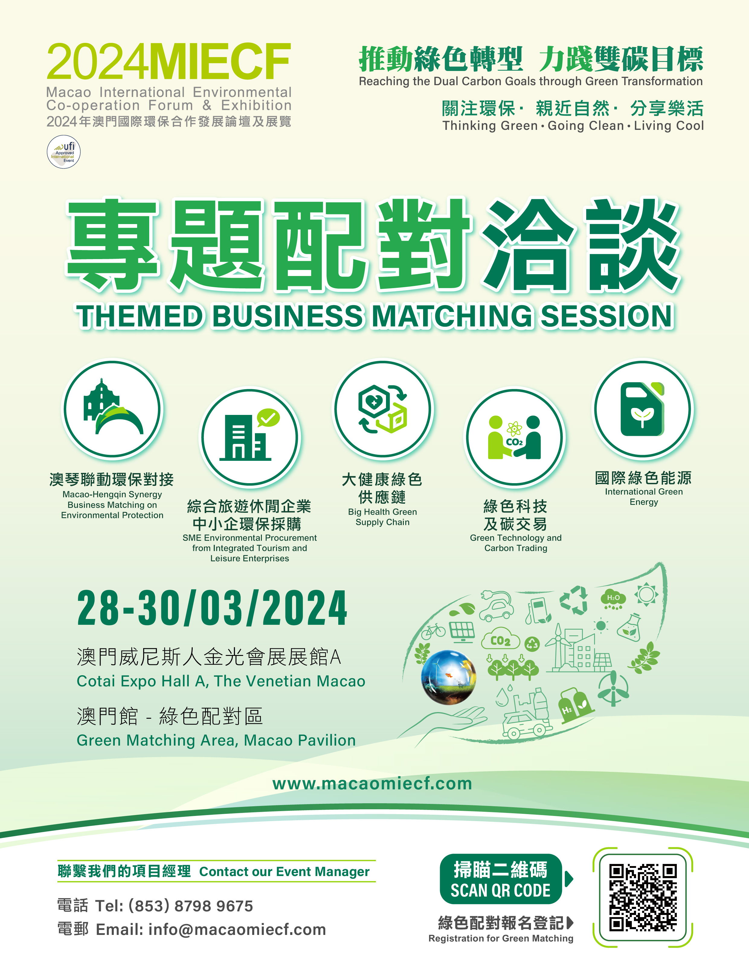 有意參與綠色配對之客商可掃瞄附圖海報中的二維碼或登入(https://www.macaomiecf.com/miecf2024/event/green-matching)預先登記。大會將根據客商提供之配對需求和意向,對接適合的合作伙伴,安排現場配對洽談;綠色配對區內將設有翻譯及駐場人員提供業務對接諮詢等配套服務,為企業搭建互動交流平台,助力推動“1+4”重點產業的綠色發展和轉型,促進國際環保交流與合作,締造綠色商機。